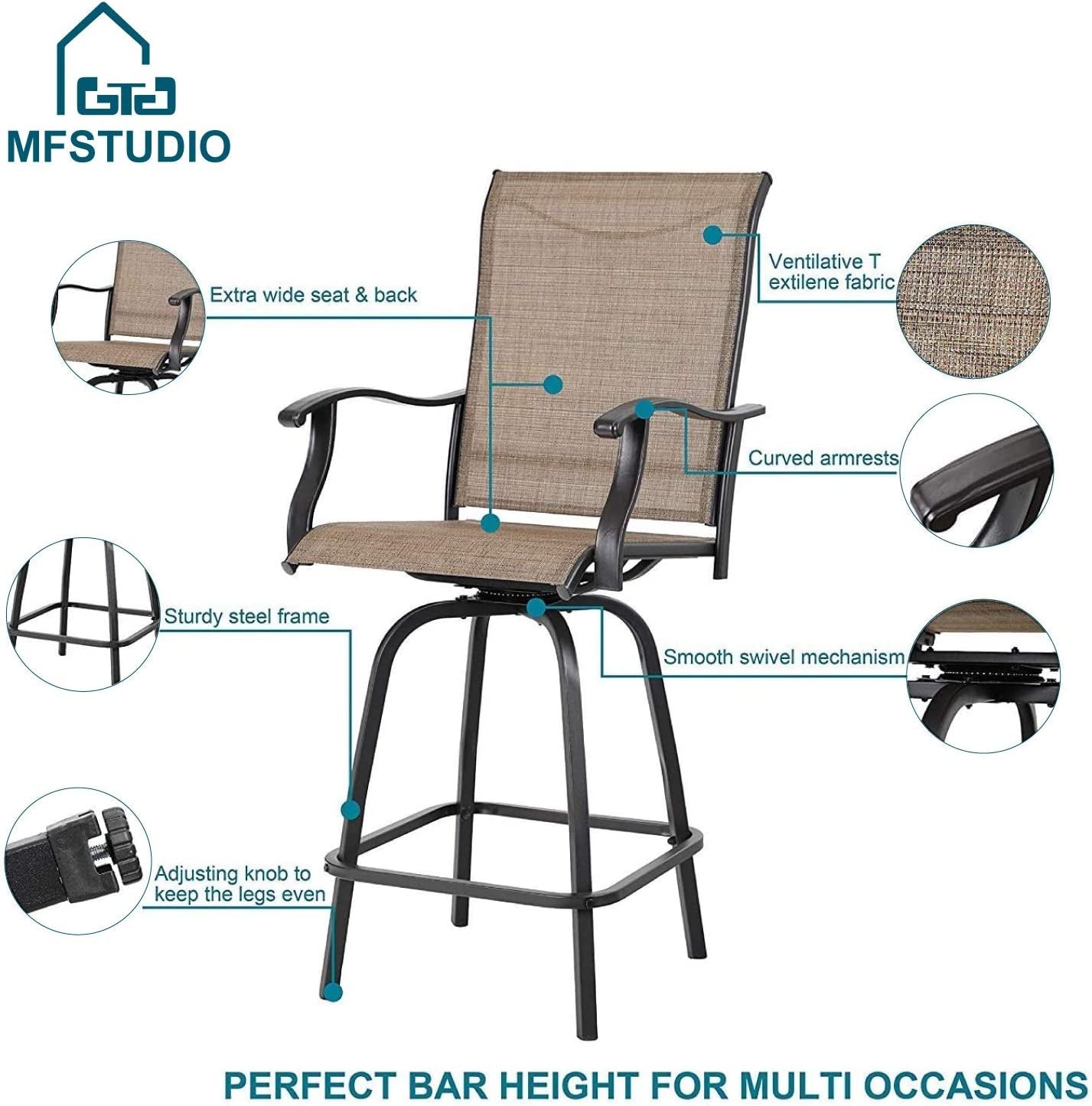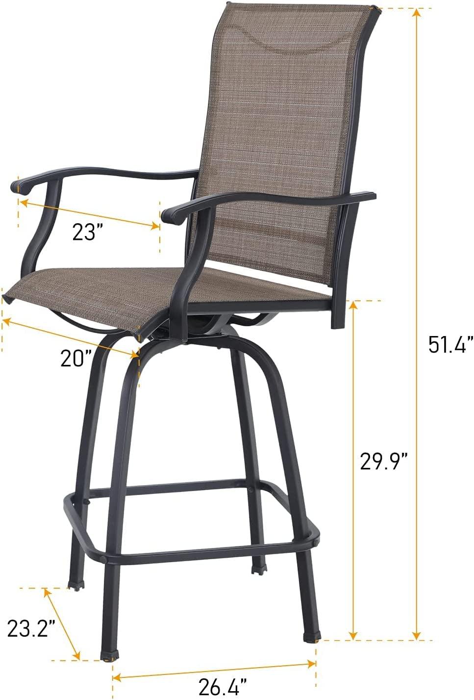 2 PCS Outdoor Swivel Bar Stools, Patio Bar Height Chair Breathable Sling Fabric, All-Weather Resistant, Brown