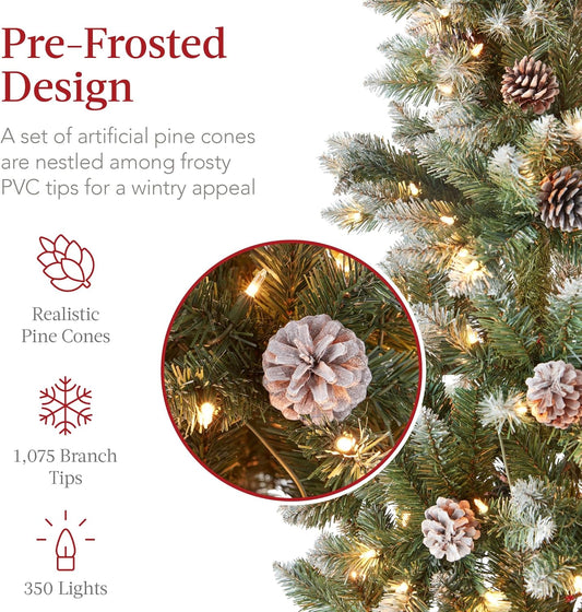 7.5Ft Pre-Lit Pencil Christmas Tree, Partially Flocked & Frosted Slim Holiday Tree Decoration, Skinny Xmas Tree, 350 Lights, 1,075 Frosted Tips, 64 Pine Cones, Foldable Stand